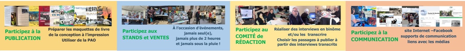 Paroles de Rochelais numérise les photos que ces témoins de la vie rochelaise lui confient. Son comité de rédaction, exclusivement composé de bénévoles, assemble ces témoignages et ces photos souvenirs pour les pérenniser sous forme de livres qu’elle se plait à nommer « cahiers mémoire ».